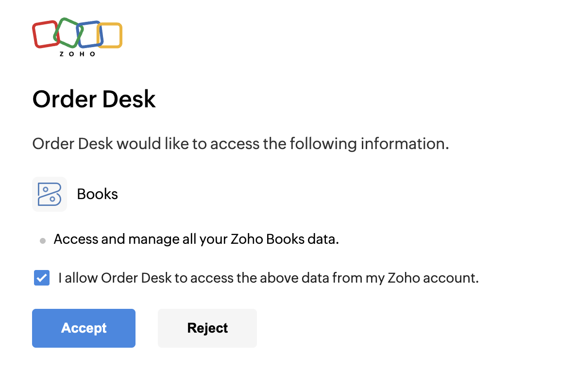 You’ll be redirected to Zoho Books to allow Order Desk access to your account. Once done, click Accept.