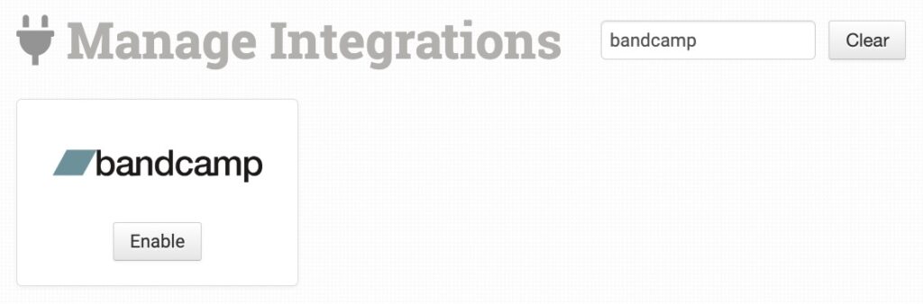In Order Desk, click on  Manage Integrations under the Integrations menu in the left sidebar. Under the Shopping Carts tab, find and enable Bandcamp.