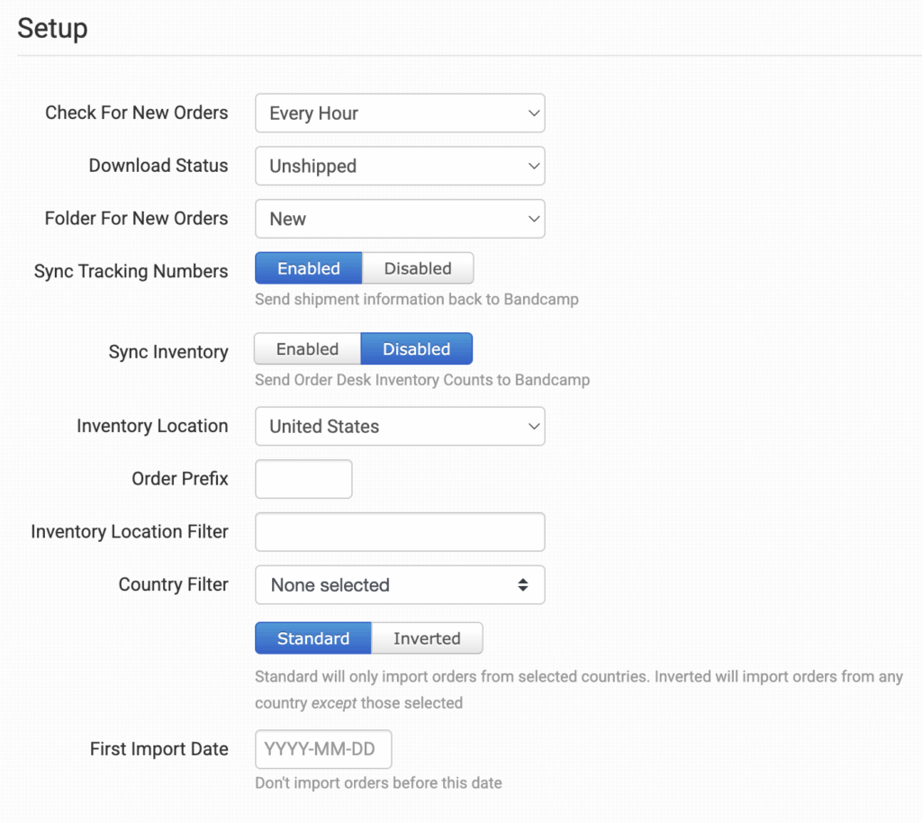 The inventory location name must match exactly as it is on your inventory items in Order Desk. When importing new orders from Bandcamp, Order Desk will look at the SKUs on the items and compare to the SKUs in your inventory here. Any orders with items for a location that isn’t listed in this field will not be imported.