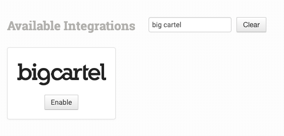 In Order Desk, click on Manage Integrations under the Integrations menu in the left sidebar. Under the Shopping Carts tab, find and enable Big Cartel.