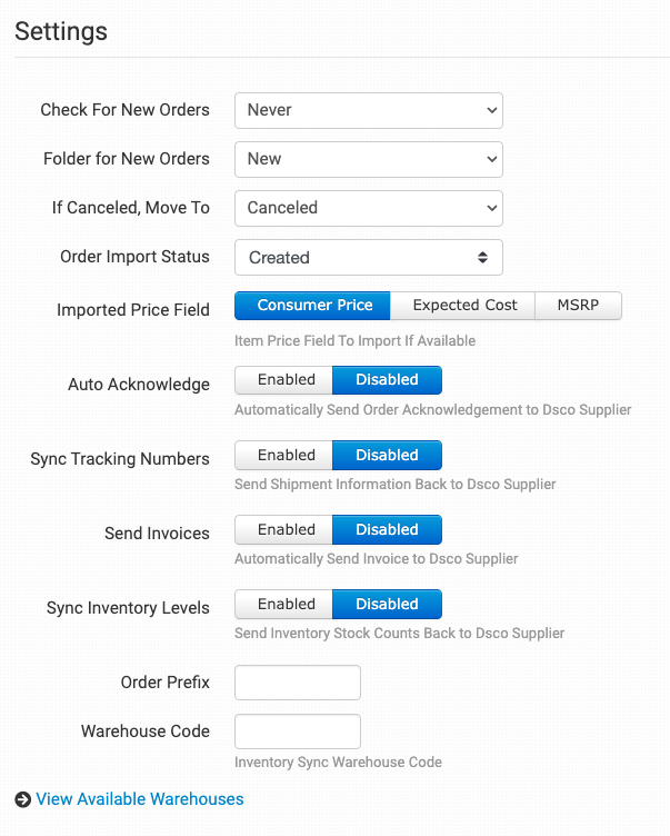Click this link to view your available warehouse names as well as their Warehouse Code, Dsco ID, and Supplier ID.
