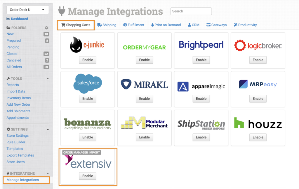 In Order Desk, click on Manage Integrations under the Integrations menu in the left sidebar. Under the Shopping Carts tab, find and enable the Extensive Order Manager integration:
