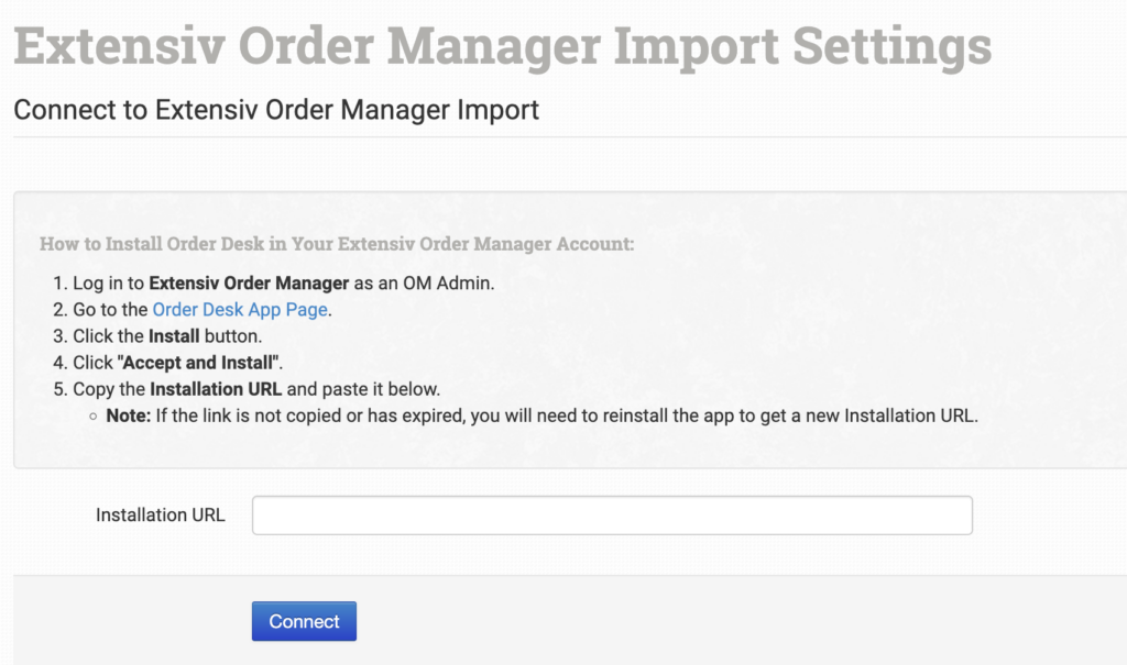 If the URL isn’t copied right away or has expired, you’ll need to reinstall the Order Desk app in Extensiv Order Manager to generate a new Installation URL.