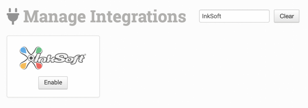 In Order Desk, click on Manage Integrations under the Integrations menu in the left sidebar. Under the Shopping Carts tab, find and enable InkSoft.