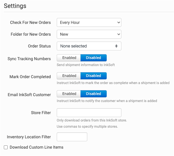 If you want Order Desk to notify InkSoft when orders are fulfilled, enable the Sync Tracking Numbers setting.