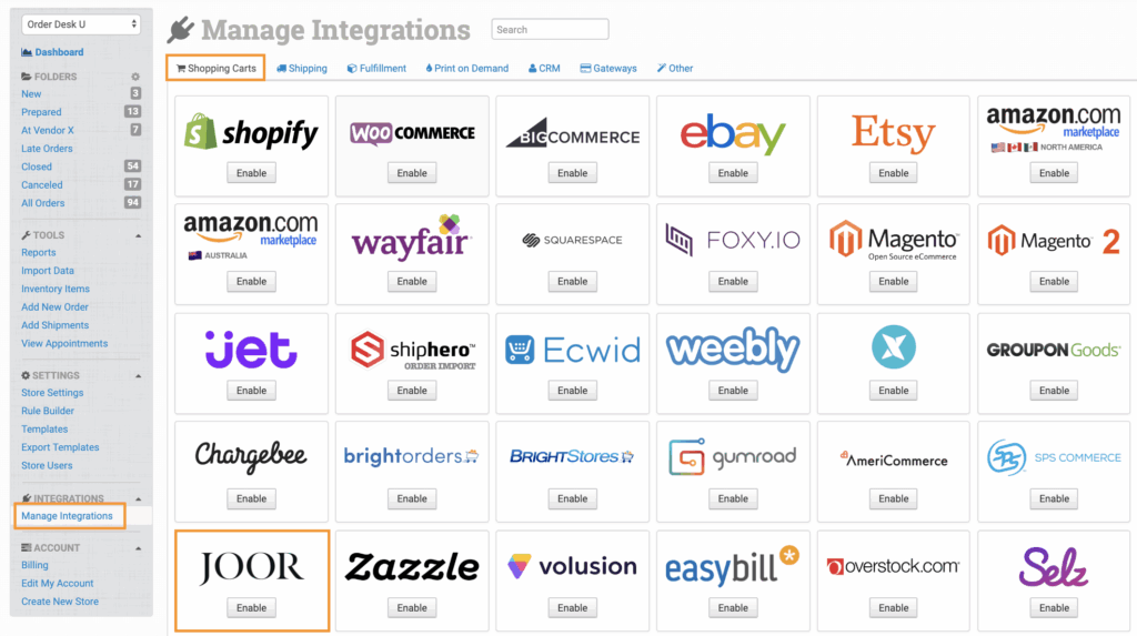In Order Desk, click on Manage Integrations under the Integrations menu in the left sidebar. Under the Shopping Carts tab, find and enable Joor.