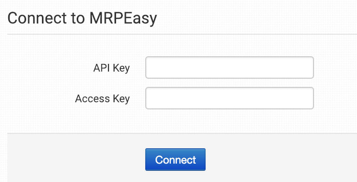 Once enabled, enter your MRPeasy API Key and Access Key and click to connect.