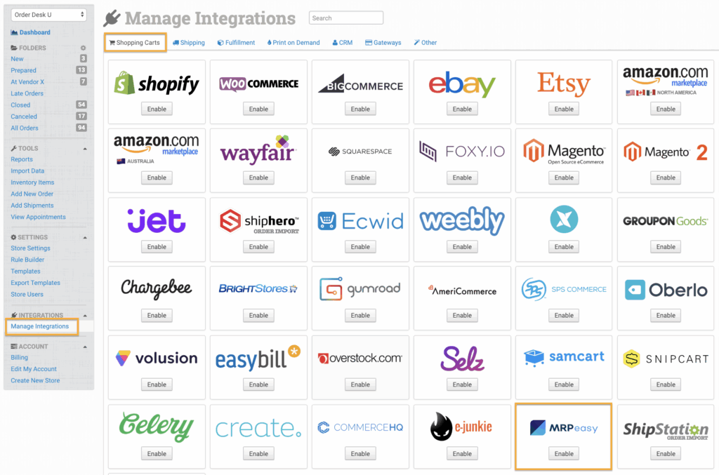 In Order Desk, click on Manage Integrations under the Integrations menu in the left sidebar. Under the Shopping Carts tab, find and enable MRPeasy.