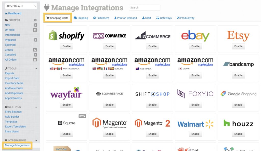 To begin, click on Manage Integrations from the left sidebar in Order Desk. Under the Shopping Carts tab, find and click to enable Overstock.