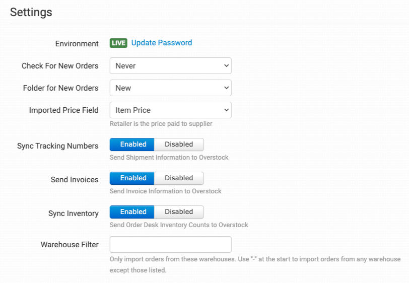 If you want Order Desk to sync your inventory availability back to Overstock, enable the Sync Inventory setting.