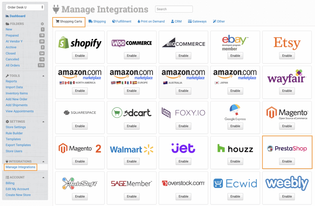 In Order Desk, click on Manage Integrations under the Integrations menu in the left sidebar. Under the Shopping Carts tab, find and enable PrestaShop.
