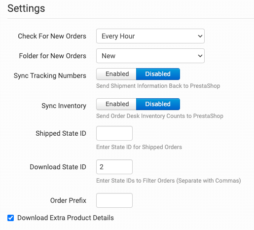 Set the status IDs for the orders to be downloaded from PrestaShop. If this is left empty, all orders will import into Order Desk.
