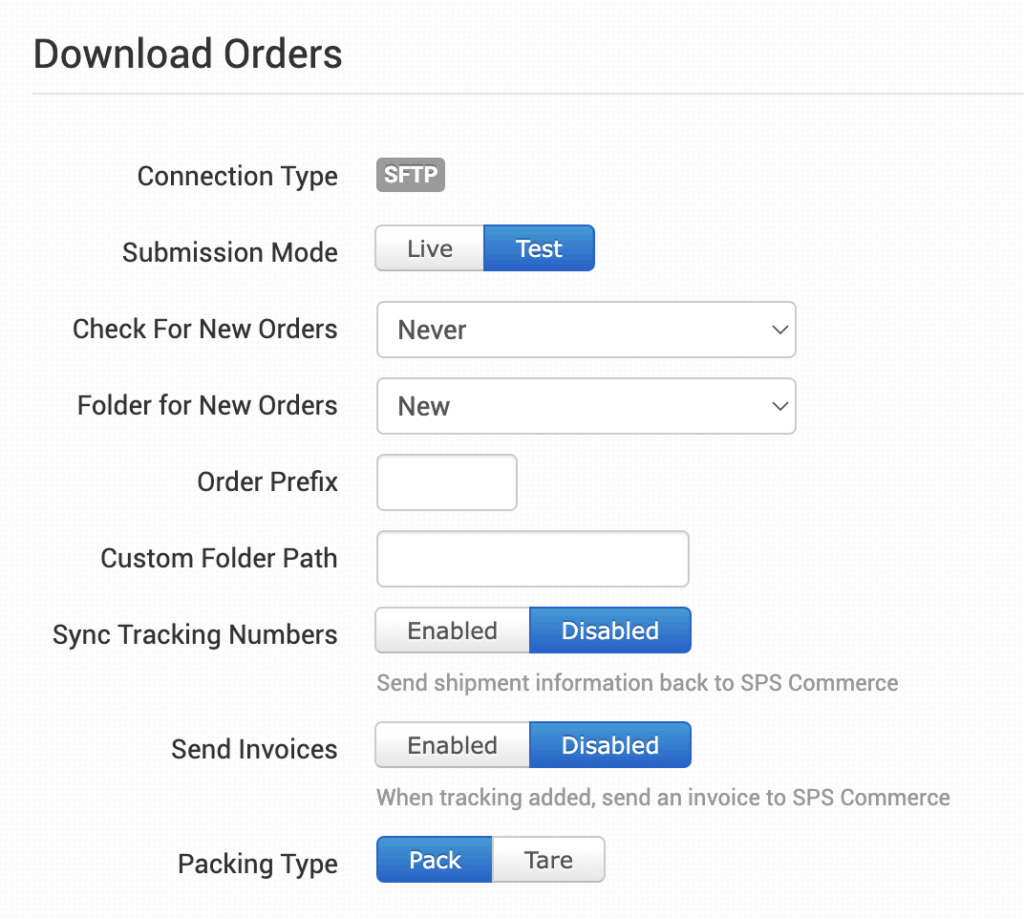 Select Test when sending test orders through to SPS Commerce. When ready to send live orders, switch this to Live.