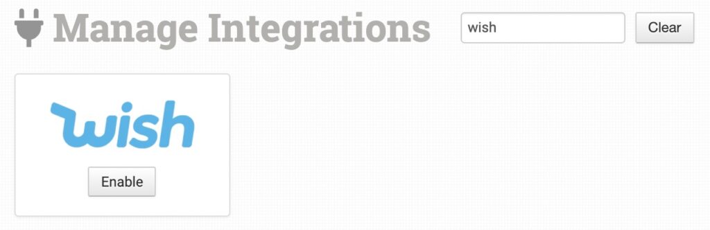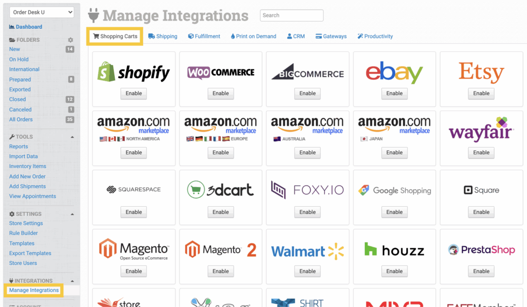 To begin, click on Manage Integrations from the left sidebar in Order Desk. Under the Shopping Carts tab, find and click to enable Wish.