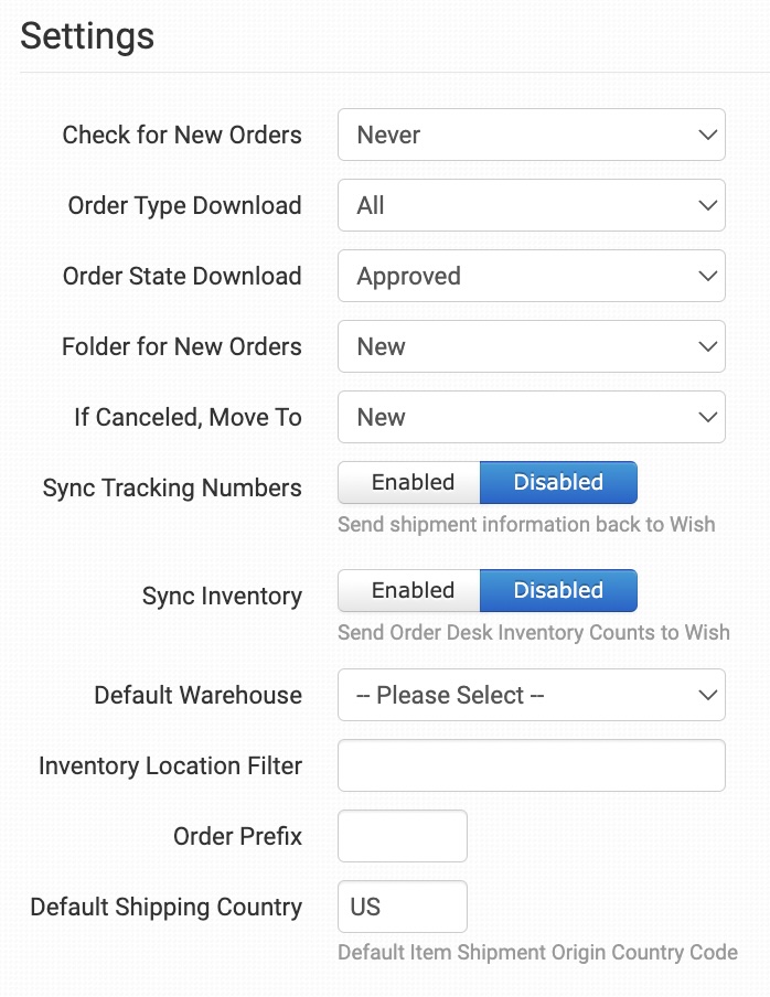 If you want Order Desk to sync your inventory availability back to Wish, enable the Sync Inventory setting.