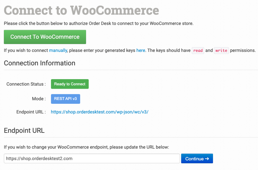 Enter your WooCommerce URL and click Continue. If you’re connected to WooCommerce’s v3 API, you’ll be shown an authorization link so your credentials can be input manually.