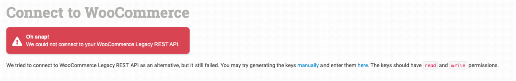If you’re not connected to WooCommerce’s v3 API, you’ll be able to click the Test Legacy REST API Connection. Doing so will confirm whether or not you’re connected to the Legacy API.