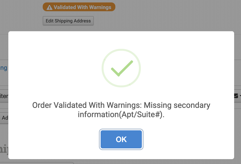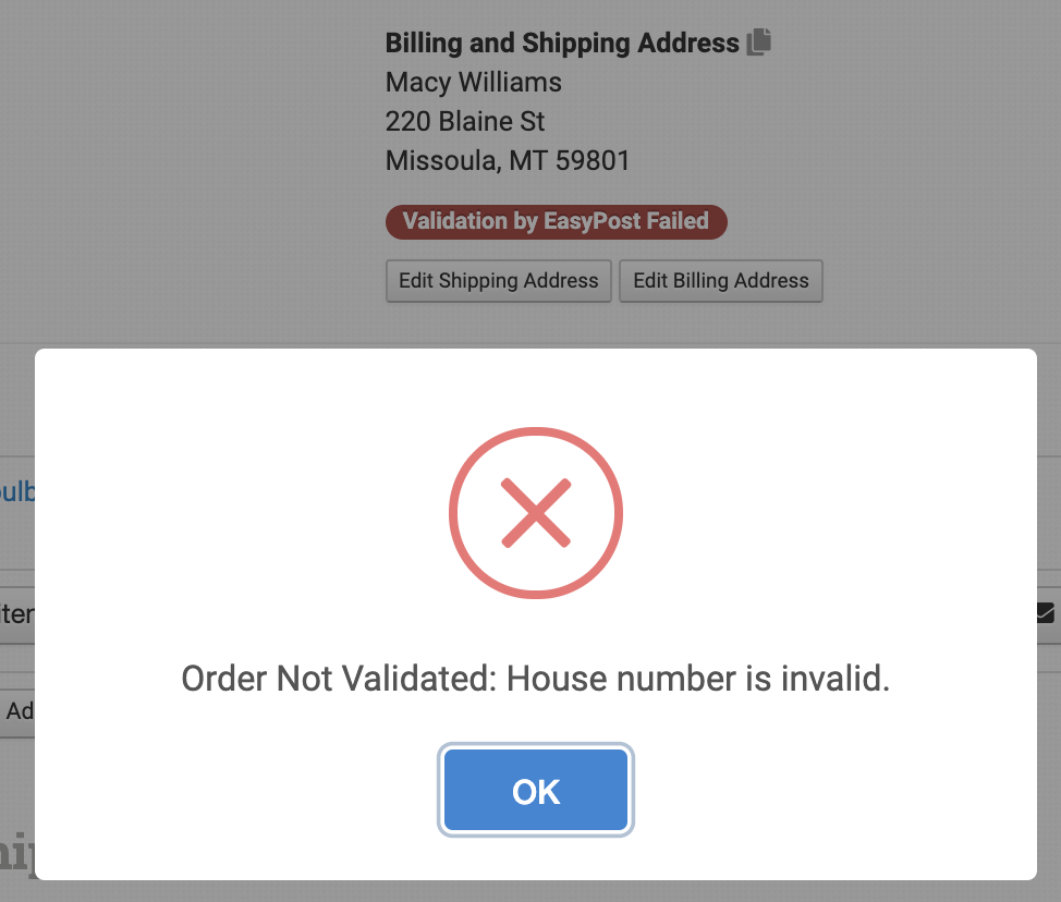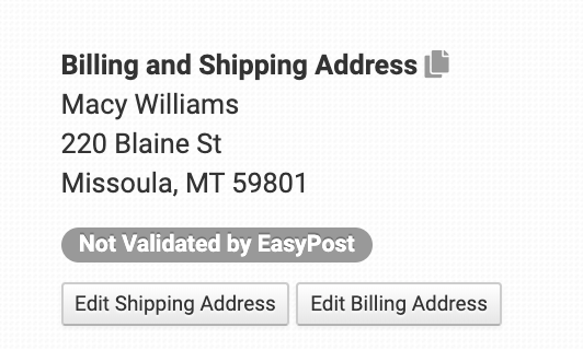 Click the gray Not Validated by EasyPost icon and EasyPost will check the address and provide information if it isn’t valid: