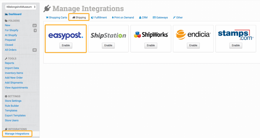 In Order Desk, click on Manage Integrations in the left sidebar. Under the Shipping tab enable the EasyPost Integration.