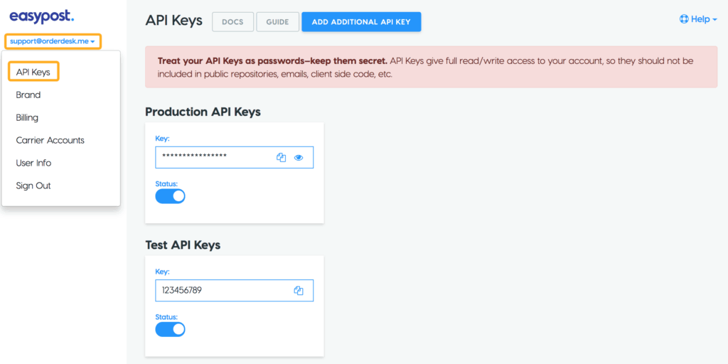 Get your API Keys from EasyPost. These will need to be added to the integration in Order Desk.