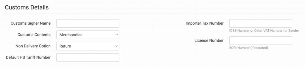 • The License Number is for senders who are registered for EU Economic Operators Registration and Identification number (EORI). If you have an EORI number registered, you must set the EORI number in this field, which will be sent to EasyPost in the shipment options to be relayed to the carriers.