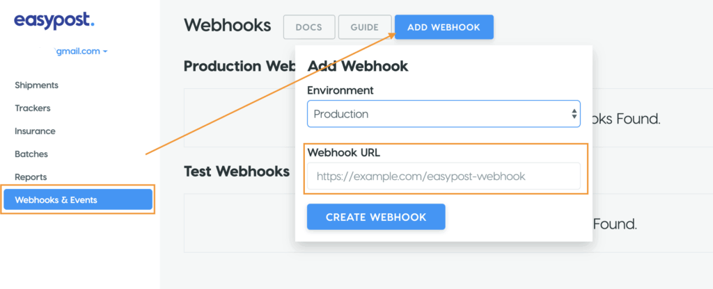 This custom URL is assigned to your account when the integration is enabled and is used by EasyPost to send tracking status and shipping updates to Order Desk. Enter this URL at EasyPost if you require this functionality. Webhooks can be added from the Webhooks & Events page in EasyPost: