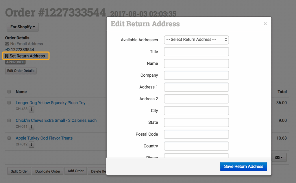 To set the return address for each order, click on Set Return Address in the the order. Choose an available address or add a new one for the order.