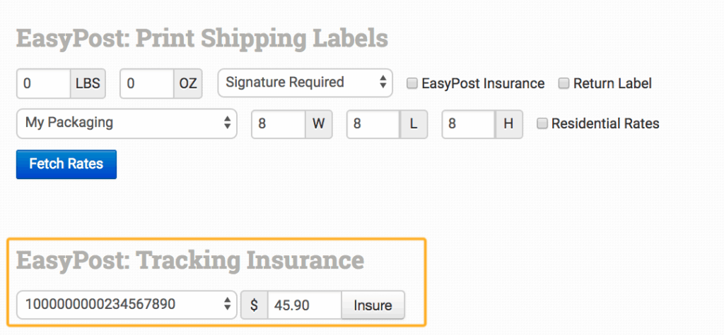 To purchase insurance after a label has been created, the tracking numbers for an order will appear under the EasyPost label creator. Select the tracking number you want to buy insurance for and follow the prompts.