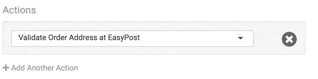 In the Rule Builder, set up a rule with the event and filters of your choice, then choose the action Validate Order Address at EasyPost: