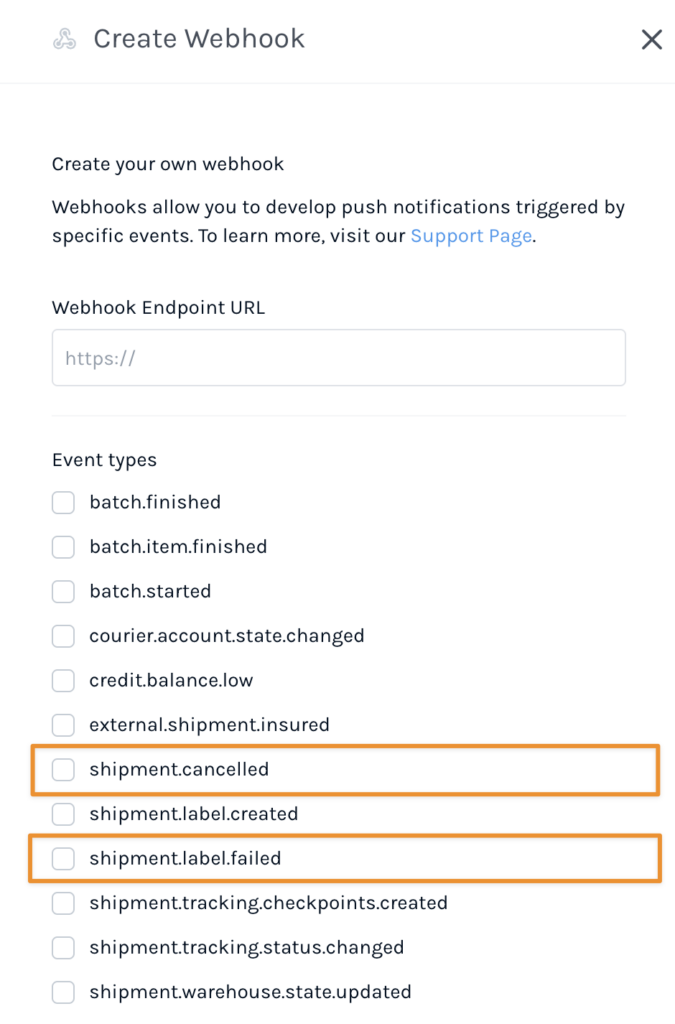 When adding the Webhook URL to your Easyship account, make sure to enable, at least, the following Event types: