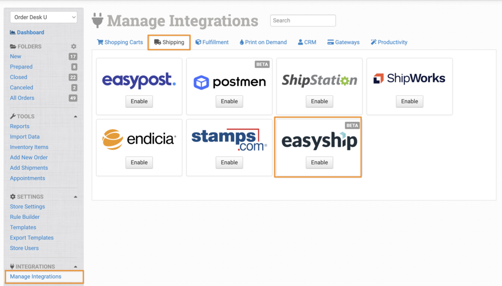 In Order Desk, click on Manage Integrations in the left sidebar. Under the Shipping tab, enable the Easyship integration.