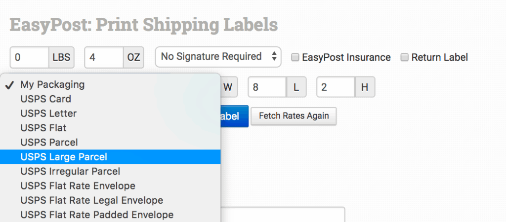 Choose the package type being used from the package dropdown. If using your own custom packaging leave it set to My Packaging, otherwise choose the specific carrier and package or envelope type so the right rates will be given for your shipment.