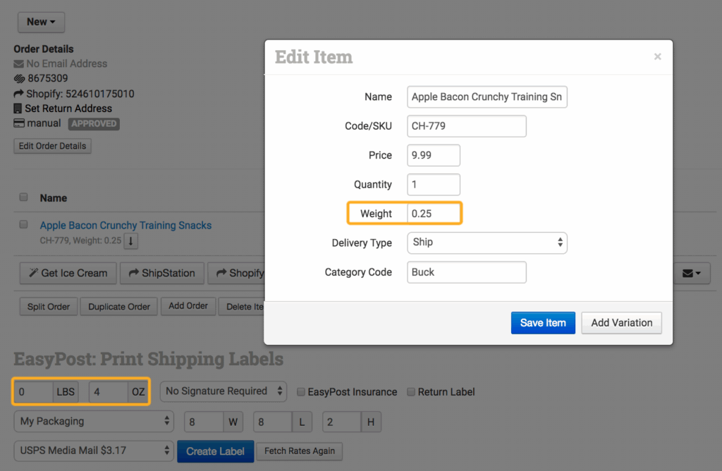 When creating labels for international orders, if you get an error that says “Missing but required: product weight”, ensure that both item weight and the Package Weight are accurate.