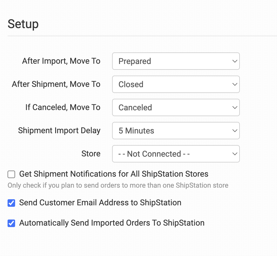 After creating a manual store in your ShipStation account following the instructions in the ShipStation setup guide, you can adjust the details about how Order Desk handles your ShipStation orders, starting with the Setup and Advanced Settings sections.