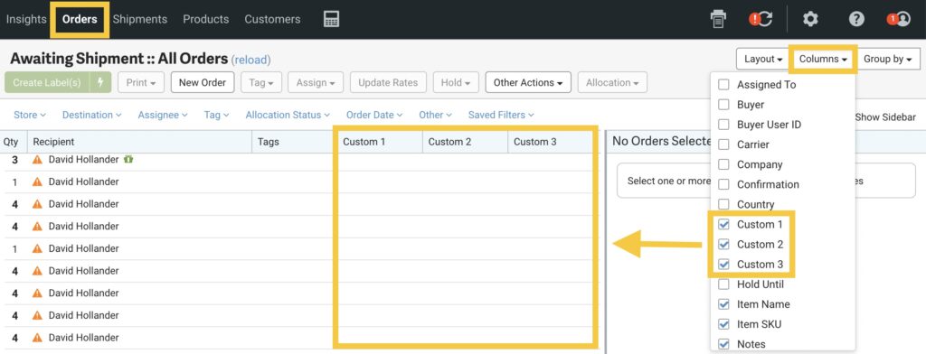 To add these columns in ShipStation, click on Orders then Columns and select Custom 1, Custom 2, and/or Custom 3 to have them show up in the order details: