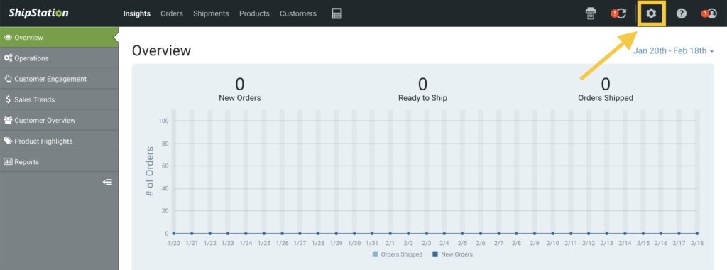 In your ShipStation account, click on the gear icon in the upper right to open your account settings: