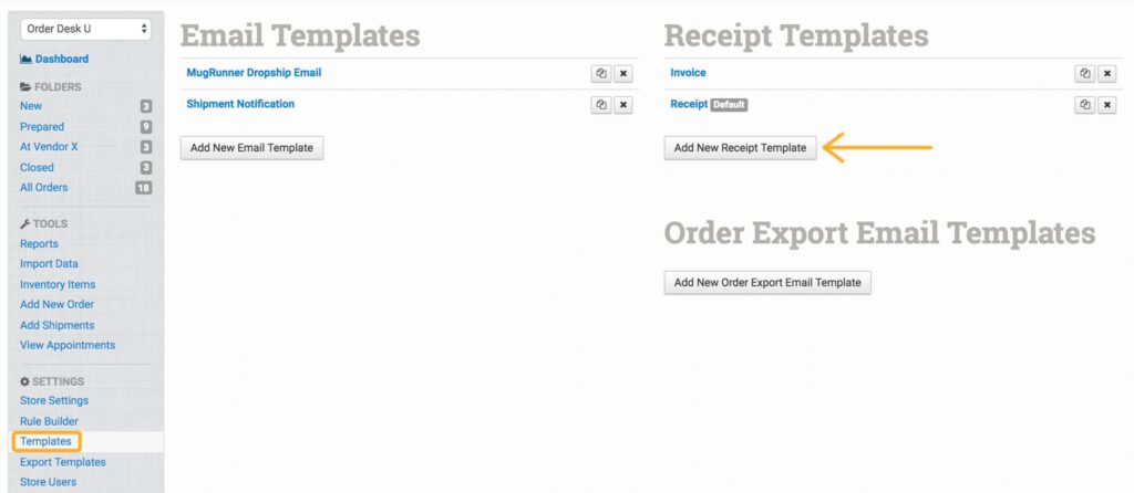 To create a receipt template, click on Templates in the Settings menu in the left sidebar. Under the Order Documents section, click on Add New Receipt Template.