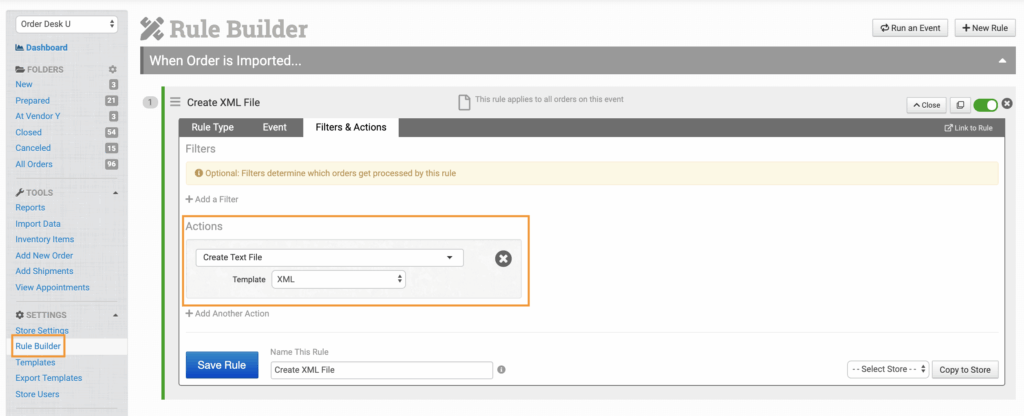 Once your template has been created, head into the Rule Builder to to create a rule that will add the XML file to your orders.