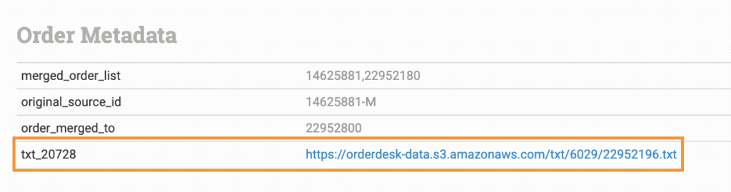 To find the link to your file, look down at the bottom of the order details page in the Order Metadata section. The file will be added under txt_xxx, where xxx is the template ID, which can be found in the URL of the template you created in the first step: