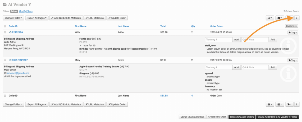 To see more information about the orders in a folder, click the i button to view the quickview for each order in the folder:
