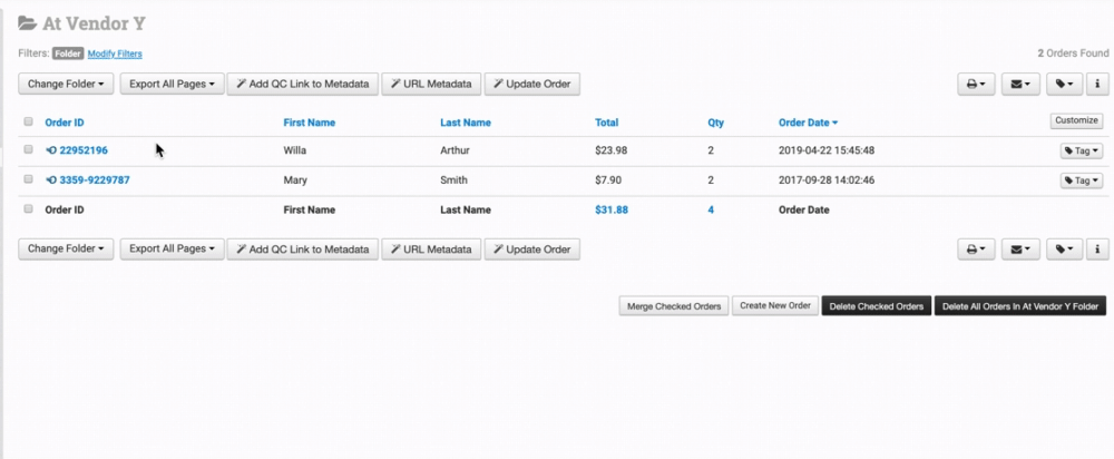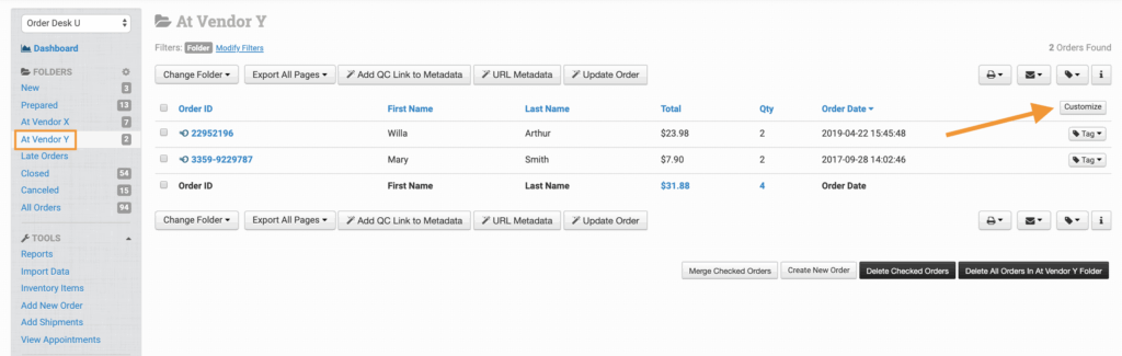 The default columns available in each folder are Order IDFirst NameLast NameTotalQty, and Order Date: