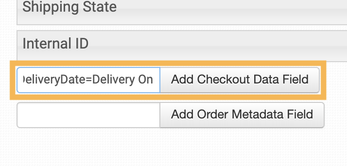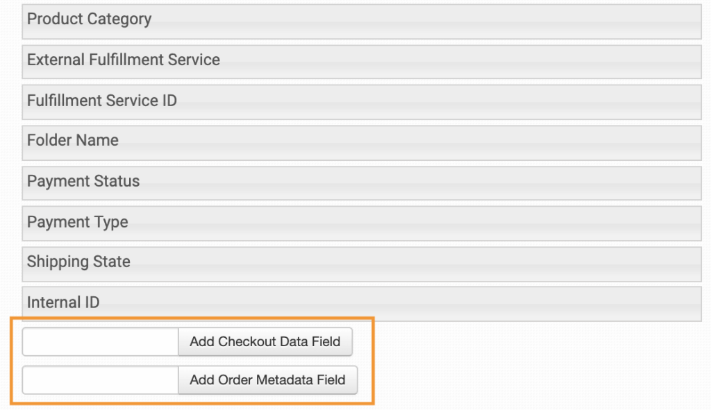 If you need to add any of your checkout data or order metadata fields as a column, add the field name to the appropriate box and click the button. This must be an exact match to the field name for it to display the information. For example, if your field name is DeliveryDate, then you must use DeliveryDate, not Delivery Date or deliverydate, etc.