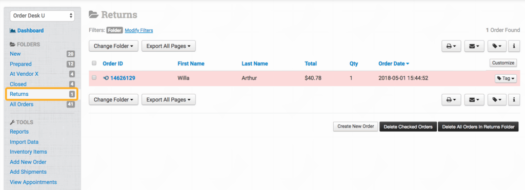 When you handle a return, move the order into the Returns folder. Keep in mind that the folder is only a label. If you need to take any actions on the orders when it is moved into the Returns folder, you will either need a rule to tell Order Desk what to do or you will have to manually act on the order. If you are unfamiliar with the Rule Builder, see the How to Work with Rules guide.