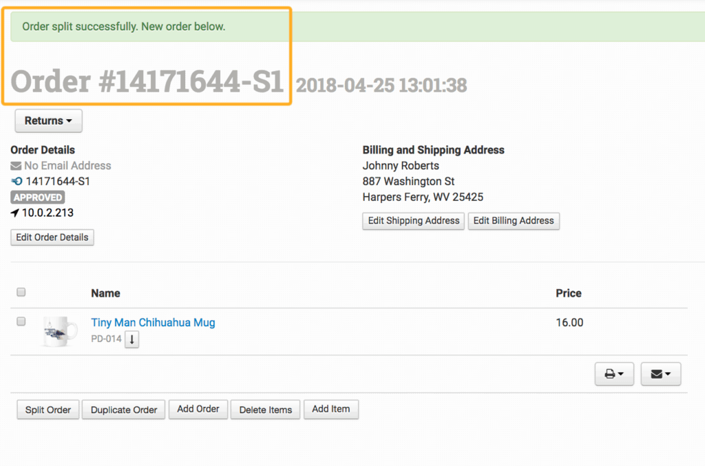 The items split into their own order and a suffix (-S2, -S3, etc.) will be added to the order number: