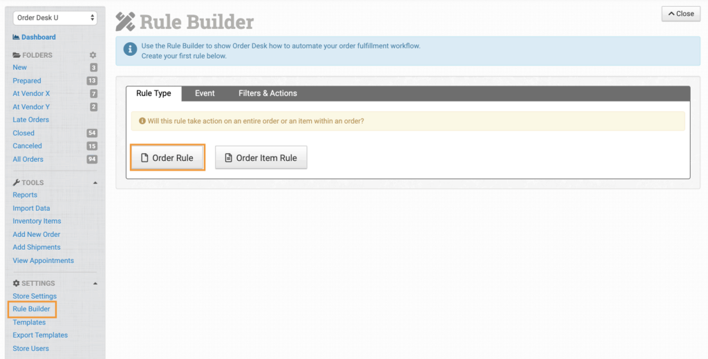 To create your rule, click on Rule Builder from the Settings menu in the left sidebar, choose the Order Rule type: