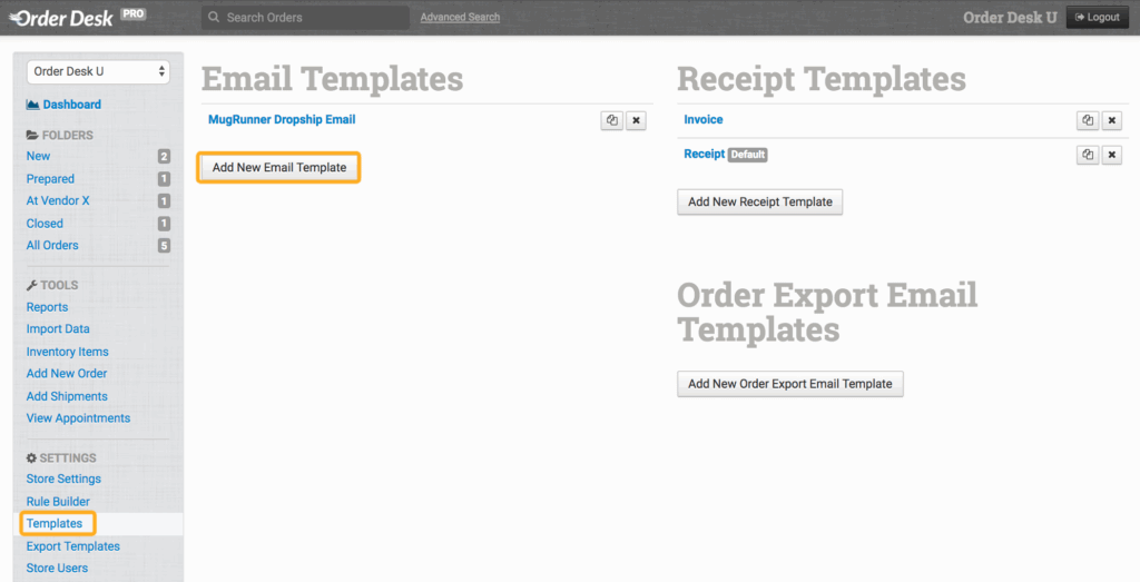 To send shipment and tracking notifications to your customers, you first need to create the email template that will be used for these emails. To do this, click on Templates under the Settings menu in the left sidebar, then click to Add New Email Template.