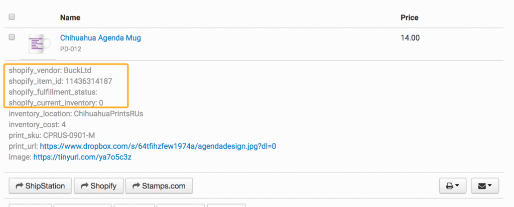 Splitting by an item’s metadata is the most versatile and easily customizable option for splitting your orders. In many cases, metadata will come in from your shopping cart with your items, such as these metadata fields that came in from Shopify: