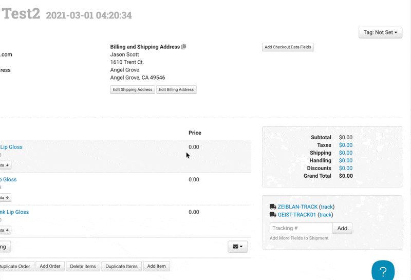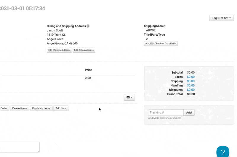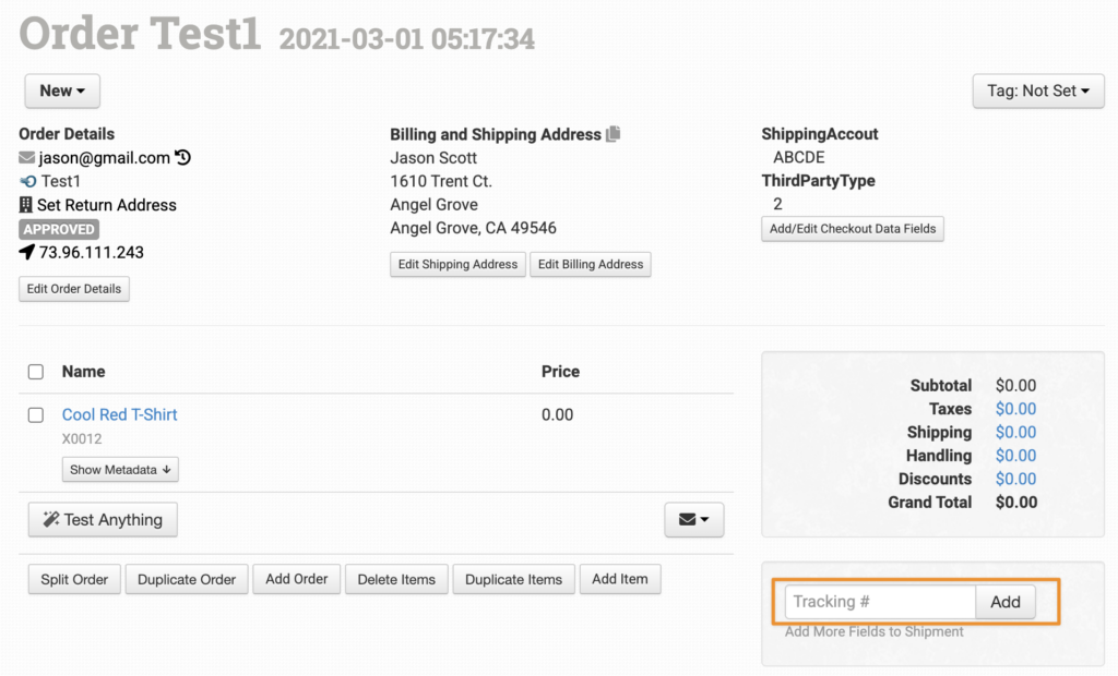 Within an order, you can quickly add a shipment by entering a tracking number in the Tracking field beneath the order totals and clicking Add.