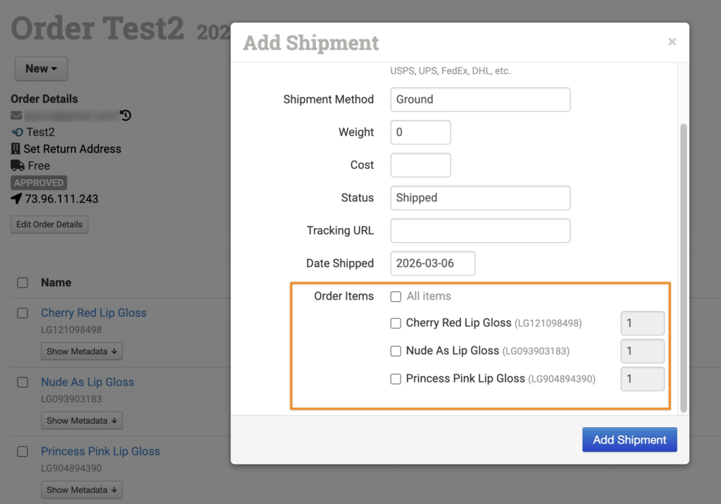The following notes cover shipment behaviors that may vary depending on your cart or fulfillment setup.