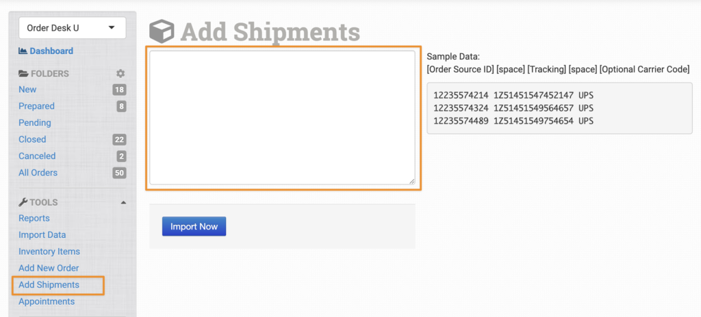 To access the tool, go to Tools in the left sidebar of your Order Desk account and select Add Shipments. From there, enter the order numbers and tracking information in the format shown below and click Import Now to create shipments in bulk.
